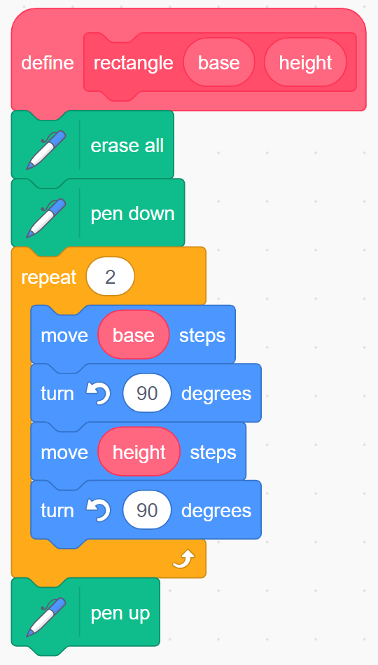 For example, it is possible to create a custom block that, when executed, calls a series of specific instructions (a subprogram). The first step is to create a block with two adjustable parameters (for example, base and height). In this case, the "rectangle" block sends the message to start executing the code below the "define: rectangle" block. This ensures that a rectangle of any size can be generated anywhere on the canvas, because the rectangle has been defined. Once the rectangle has been drawn, the main code continues.