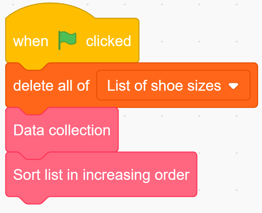 Reading code that uses subprograms requires practice and an understanding of the general structure of the code in question. For example, when reading the following code, the student will be able to deduce that the code will remove items from a list, do a data collection, and sort the data in ascending order. However, a great deal of information is omitted from this code, as the blocks in pink call for subprograms. The student must first stop reading the main code to look at the subprogram in question to understand the meaning of the code.