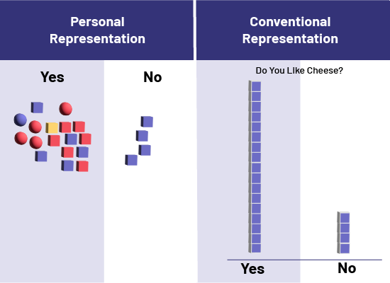 Image Two tables with two columns, the first for Yes and the second for No. Title of the first table: Personal Representation In the Yes column, 17 logical blocks of different shapes and colors. In the No column, 4 logical blocks of square shape and blue color. Title of the second table: Conventional Representation. The question is, Do you like cheese? In the column Yes, eight logical blocks of square shape and blue color. In the column No, four logical blocks of square shape and blue color.
