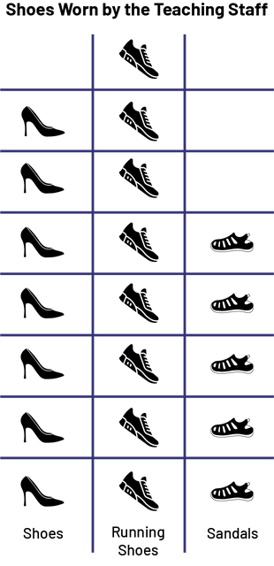 Picture Graph Chart with illustrations, titled Shoes Worn by the Teaching Staff, formed with three columns: the Shoes column, which has seven pumps, the Running Shoes column, which has eight sneakers, and the Sandals column, which has five sandals.