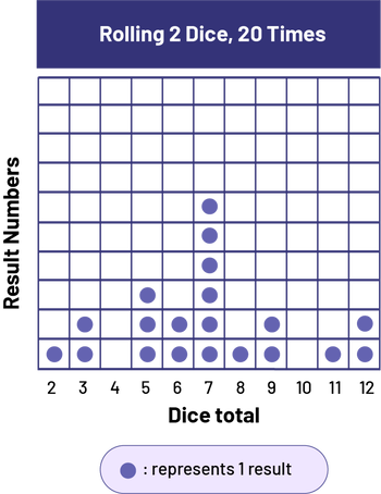Pictograph Image Diagram with illustrations, titled Rolling two dice, formed by a grid of 110 cells. Title of the vertical axis: Result Numbers. Title of the horizontal axis: Dice total Horizontal axis numbered from 2 to 12. Column 2: one chip Column 3: two chips Column 4: zero chipsColumn 5: three chipsColumn 6: two chips Column 7: six chips Column 8: one chipColumn 9: two chips Column 10: no chips Column 11: one chipColumn 12: two chipsLegend: each chip represents one result