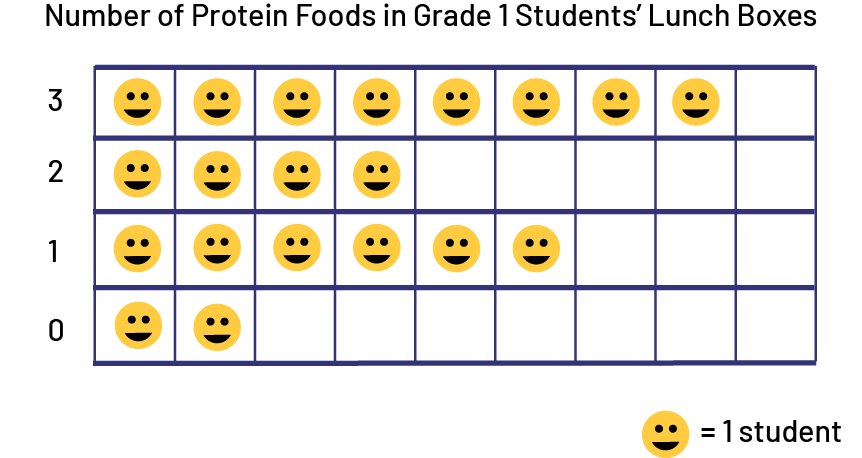 image Pictograph chart, titled “Number of Protein Foods in Grade One Student Lunch Boxes”, made of four rows numbered 0 through 3. Row 0: two smiley faces Row 1: Six Smileys Row 2: four smileys Row 3: eight smileys Legend: one smiley face equals one student Image Pictograph chart, titled “Number of Protein Foods in Grade One Student Lunch Boxes”, made of four rows numbered 0 through 3. Row 0: two smiley faces Row 1: Six Smileys Row 2: four smileys Row 3: eight smileys Legend: one smiley face equals one student