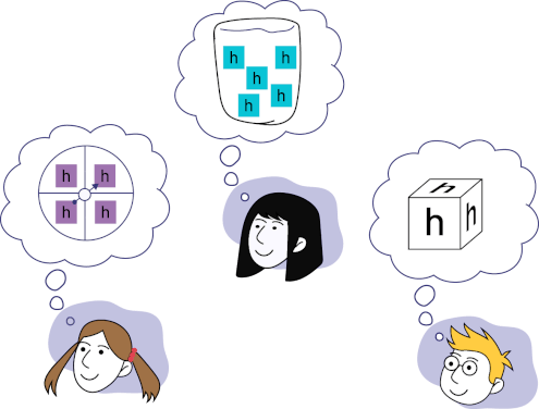 Image Three character heads representing teachers: the first character thinks of a roulette wheel divided into four parts each with the letter "h", the second, a container that holds five "h’s ", and the third, a cube with the letter "h" on each side.