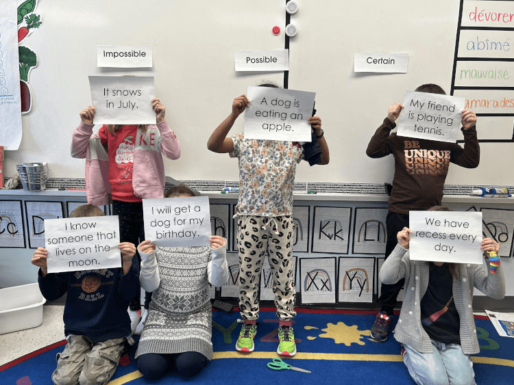 Image Photo of six students posing in a classroom, in front of a green chalkboard with the words Impossible, Possible, and Certain displayed on. Three students are holding impossible statements and are therefore standing under the “Impossible” sign. One student is holding a possible statement and is standing under the “Possible” sign. Two students are holding Certain statements and are standing under the “Certain” sign.