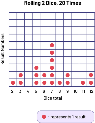 Image Diagram with illustrations, titled Rolling two dice, formed by a grid of 110 cells. Title of the vertical axis: Result Numbers. Title of the horizontal axis: Dice total Horizontal axis numbered from 2 to 12. Column 2: one red chip Column 3: two red chips Column 4: zero red chips Column 5: three red chips Column 6: two red chips Column 7: six red chips Column 8: one red chip Column 9: two red chips Column 10: no red chips Column 11: one red chip Column 12: two red chips Legend: each red chip represents one result