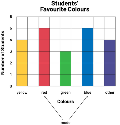 Image Vertical bar graph, titled Students’ Favourite Colours, consisting of a yellow bar, a red bar, a green bar, a blue bar and a purple bar. Title of the vertical axis: Number of students The vertical axis is numbered from 0 to 6. Title of the horizontal axis: Colors Yellow: 4 students Red: 5 students Green: 3 students Blue: 5 students Other: 4 students The mode is red and blue.
