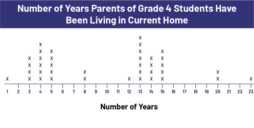 Image The count line is titled: "Number of parents grade 4 have been living in current home.” The line labeled "Number of Years" is scaled from 1 to 23. The number 1 shows the presence of one X. Number two has no Xs. Number 3 has 4 Xs. Number 4 has 6 Xs. Number 5 shows 5 X's. Numbers 6 and 7 show no Xs. Number 8 has two X's. Numbers 9, 10 and 11 have no Xs. Number 12 has one X. Number 13 has 7 X's. Number 14 has 4 X's. Number 15 has 5 X's. Numbers 16, 17, 18 and 19 have no X. Number 20 has 2 X's. The numbers 21 and 22 have no X. Number 23 has one X.