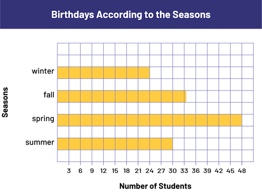 Image A diagram with 4 horizontal yellow bars is called "Birthdays Acccording to the Seasons". The horizontal axis is labeled "Number of Students", and the vertical axis is labeled "Seasons". In the spring, the bar indicates 30 students. In the summer, the bar indicates 48 students. In the fall, the bar indicates slightly more than 33 students. And in the winter, the bar indicates 24 students.