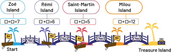 image Five mini islands of different colors are lined up side by side. They are all connected by bridges on which it is written "yes". Each island has a boat with a flag on the mast that says "no". The starting island, Zoe Island, is blue and has the following equation: empty box plus empty box equals 7. The second, Rémi Island, is purple and has the following equation: empty box plus empty box is greater than 6. The third, Saint-Martin Island, is red and has the following equation: empty box plus empty box is smaller than five. The fourth, Milou Island, is orange and has the following equation: empty box plus empty box equals 12. It leads to the last island, Treasure Island, which is yellow.