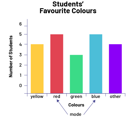 image The coloured five bar graph is titled: "Students’ Favorite Colours". The horizontal axis is named "Colours", while the vertical axis is named "Number of Students". The yellow bar goes up to the number 4. The red bar goes up to number 5. The green bar goes up to the number 3. The blue bar rises to the number 5, and the purple bar meaning "Other" rises to the number 4. With arrows, the word "mode" points to the red bar and the blue bar.