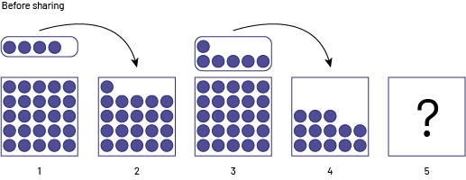 image Under the title "Before Sharing", five boxes are lined up side by side. The first box contains 25 chips. Above it, a set of 4 chips is linked to the second box by an arrow. The second box contains 21 chips. The third box contains 25 chips, and above it, a set of 6 chips points to the fourth box with an arrow. The fourth box contains 13 chips. The fifth box contains no chips, but has a question mark.