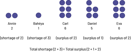 image Five sets of blue chips lined up side by side have the following names respectively: Annie, Bahéya, Carl, Daniel, Eva. The first set contains two chips and indicates a lack of two. The second set contains one chip and indicates a lack of three. The third set contains 6 chips and indicates a surplus of two. The fourth set contains five chips and indicates a surplus of one. And the fifth set contains 6 chips and indicates a surplus of two. Below the sets appears the following equation: sum of the lacks opening parenthesis two plus three closing parenthesis equals sum of the surpluses opening parenthesis two plus one plus two closing parenthesis.