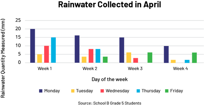 The title of the vertical multiple bar diagram is: Rainwater collected in April. The title of the x-axis is: Day of the week. The axis is graduated in four weeks, i.e. week 1, week 2, week 3 and week 4. The title of the y-axis is: Rainwater quantity measured (in millimeters). The axis is graduated by 5, from 0 to 25. There is a legend: blue is Monday, yellow is Tuesday, red is Wednesday, light blue is Thursday and green is Friday. Below the legend it says "Source: School B Grade 5 Students".