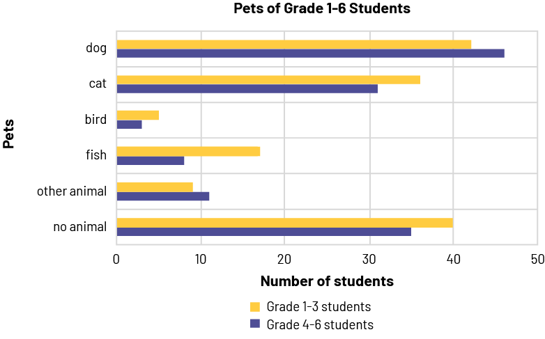 The data can be organized in a way that makes it easier to compare categories of data with each other. For example, to compare the number and type of pets of students in Grades 1 to 6, data for Grades 1 to 3 and Grades 4 to 6 could be combined and represented in a double bar.