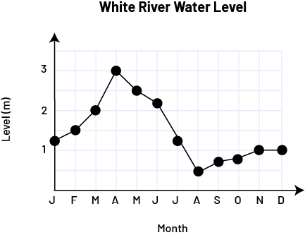 image The broken line diagram with connected dots is titled "White River Water Level". The horizontal axis is named "Month" while the vertical axis, graduated from zero to three, is named "Level in meters". At the letter J, the point is slightly above one. At the letter F, the point is at one and a half. At the letter M, the point is at two. With the letter A, the dot is at three. With the letter M, the dot is two and a half. At the letter J, the point is above two. At the next letter J, the dot is between one and one and a half. At the letter A, the point is at one and a half. At the letter S, the dot is below one. At the letter O, the dot is slightly closer to number one. At the letter N and the letter D, the dot is at one.