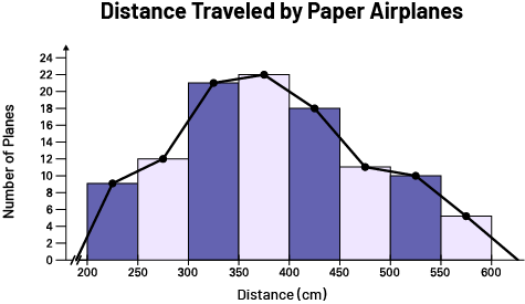 image A hybrid diagram illustrates data using 8 bars and connected dots that sit atop each bar. The chart is titled: "Distances traveled by paper airplanes". The horizontal axis, graduated from zero to 800, is named "Distance in centimeters". The vertical axis, graduated from zero to 25, is named "Number of planes". The first bar, from 200 to 250, is dark purple and rises slightly below the number ten. The second bar, from 250 to 300, is light purple and rises between ten and 15. The third bar, between 300 and 350, is dark purple and rises to 20. The fourth bar, between 350 and 400 is light purple and rises slightly above 20. The fifth bar, from 400 to 450 is dark purple and rises slightly below the number 20. The sixth bar, from 450 to 500, is light purple and rises slightly above ten. The seventh bar, from 500 to 550 is dark purple and rises to ten. And the eighth bar, from 550 to 600, is light purple and rises to five.