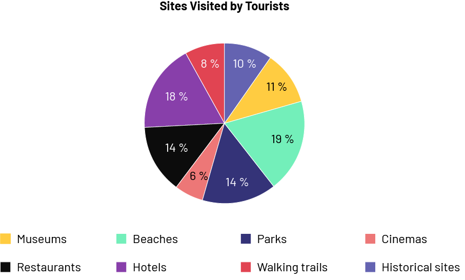 Image A pie chart is titled "Sites Visited by Tourists". It is divided into 8 parts of different colours. The Museums portion is eleven percent. The Beaches portion is 19 percent. The Parks portion is 14 percent. The Cinemas portion is six percent. The Restaurants portion is 14 percent. The Hotels portion is 18 percent. The Pedestrian Paths portion is eight percent. And the Historical Sites portion is ten percent.
