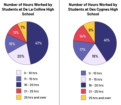 image Two pie charts are presented. The first pie chart is titled Number of hours worked by students at De La Colline High School. It is divided into five parts. The share from zero to ten hours is 20 percent, in light purple. The share from eleven to 15 hours is 15 percent, in purple. The share from 16 to 20 hours is 47 percent, in navy blue. The share from 21 to 25 hours is eleven percent, in red. And the share of 25 hours or more is seven percent, in yellow. The second chart is called Number of Hours Worked by Students at Des Cygnes High School. It is divided into five parts. The share from zero to eleven hours is 17 percent, in purple. The share from eleven to fifteen hours is 19 percent, in light purple. The share from fourteen to twenty hours is 41 percent, in navy blue. The share from 21 to 25 hours is 14 percent, in red. And the share from 25 hours and over is nine percent, in yellow.