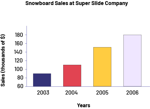image The bar graph is titled Sales of snowboards of the Super Glisse company. The horizontal axis corresponds to the years while the vertical axis, graduated from 60 to 180, corresponds to sales in thousands of dollars. The 2003 bar, in navy blue, rises to 90. The 2004 bar, in red, rises to 110. The 2005 bar, in yellow, rises to 150, and the 2006 bar, in light purple, rises to 180.