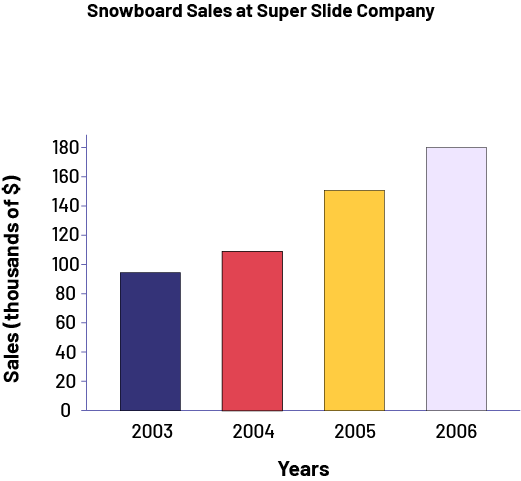 image The bar graph is titled Sales of snowboards of the Super Glisse company. The horizontal axis corresponds to the years while the vertical axis, graduated from zero to 180, corresponds to sales in thousands of dollars. The 2003 bar, in navy blue, rises to 90. The 2004 bar, in red, rises to 110. The 2005 bar, in yellow, rises to 150, and the 2006 bar, in light purple, rises to 180.