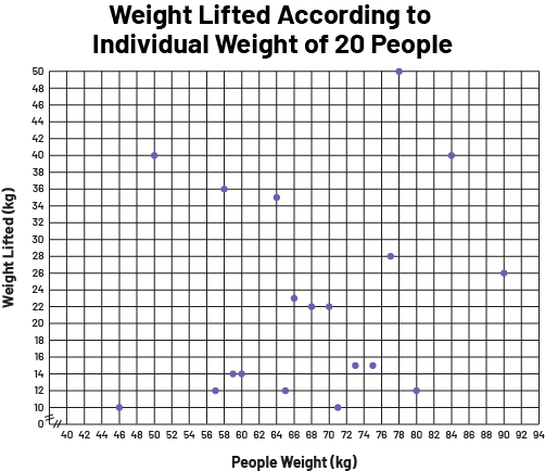 image The scatter diagram is titled "Weight Lifted According to Individual Weight of 20 People". Scaled from 40 to 94, the horizontal axis is called "People weight in kilograms", while the vertical axis is scaled from zero to 50 and is called "Weight lifted in kilograms". The scatter plot is large and spread out.