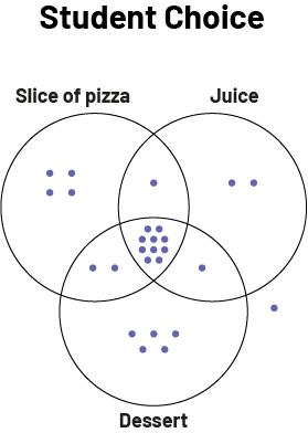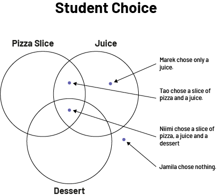 image The Venn diagram is entitled "Student Choice". The three sets are named respectively as follows: pizza slice, juice, dessert. There are four dots. The first is outside the diagram and comes with the text "Jamila chose nothing". One dot is in the common center of the three sets and comes with the text, "Niimi chose a slice of pizza, a juice and a dessert." A dot is found in the shared set between pizza slice and juice, and comes with the following text: "Tao chose a slice of pizza and a juice". And one dot is in the set exclusive to juice, and comes with the following text: "Marek chose only a juice".