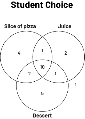 image The Venn diagram is titled "Student Choice". The three sets are named respectively as follows: pizza slice, juice, dessert. In the pizza slice exclusive set, there is a number four. In the juice exclusive set, there is a number two. In the dessert exclusive set, there is a number five. Outside the diagram, there is un number one. In the shared set with all three choices, there is a number ten. In the shared pizza slice and juice set, there is a number one. In the shared pizza slice and dessert set, there is the number two. And in the shared set of juice and dessert, there is the number five.