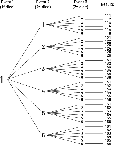 image The tree diagram elaborates all the scenarios of three events. At event one, with first die, there is the number one. At event two, with second die, there are the numbers one through six, all related to event one. And at event three, with third die, there are the numbers one through six, all related to each of the numbers one through six in event two. This gives six sets of six outcomes. In the first set of outcomes, the numbers go from 111 to 116. In the second set, the numbers range from 121 to 126. In the third set, the results range from 131 to 136. In the fourth set, the results range from 141 to 146. In the fifth set, the results go from 151 to 158. And in the sixth set, the results range from 161 to 166.