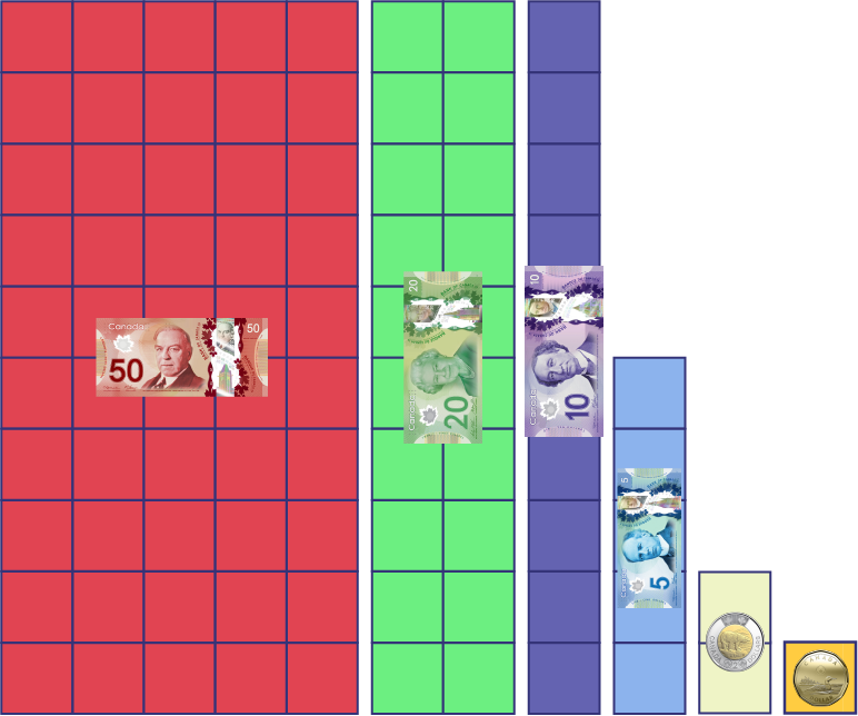 A block of 50 red squares represents a 50-dollar bill. A block of 20 green squares represents a 20-dollar bill. A block of ten blue squares represents a ten-dollar bill. A block of 5 squares represents a 5-dollar bill. A block of 2 pale yellow squares represents a 2-dollar coin. A yellow square represents a one dollar coin.