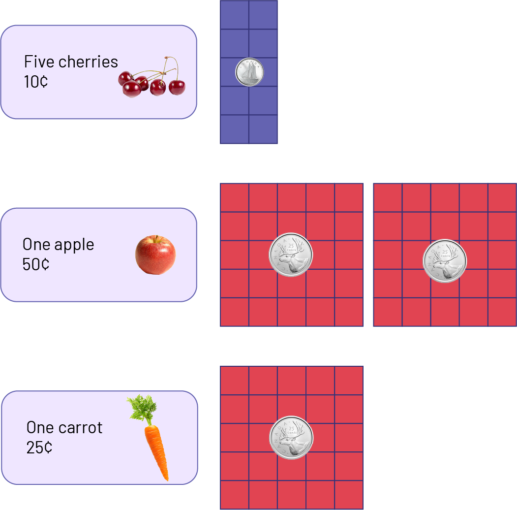 Five cherries, ten cents. Accompanied by a photo of cherries. Represented by ten squares and one ten cents. An apple, 50 cents, accompanied by a picture of an apple. Represented by two 25 cent coins, and two times a block of 25 squares. A carrot 25 cents. Accompanied by a photo of carrots. Represented by a 25 cent coin and a block of 25 squares.