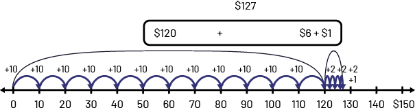 127 dollars. Numerical sentence: 120 dollars, plus 6 dollars, plus one dollar. A number line that starts at zero and continues up to 150 dollars. Plus ten jumps start at zero and repeat up to 120 dollars, then plus 2 jumps repeated 3 times, and plus one jump.