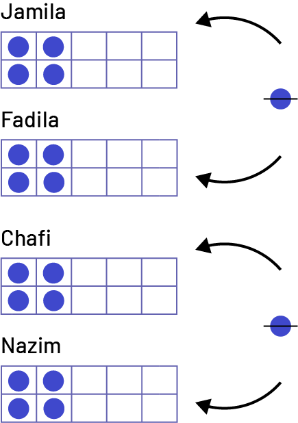 Jamila, Fadila, Chafi and Nazim's parents are preparing snacks for the week. They bought a box of 18 granola bars. They plan to put one granola bar per day in each child's lunch bag. How can they share the bars fairly?
