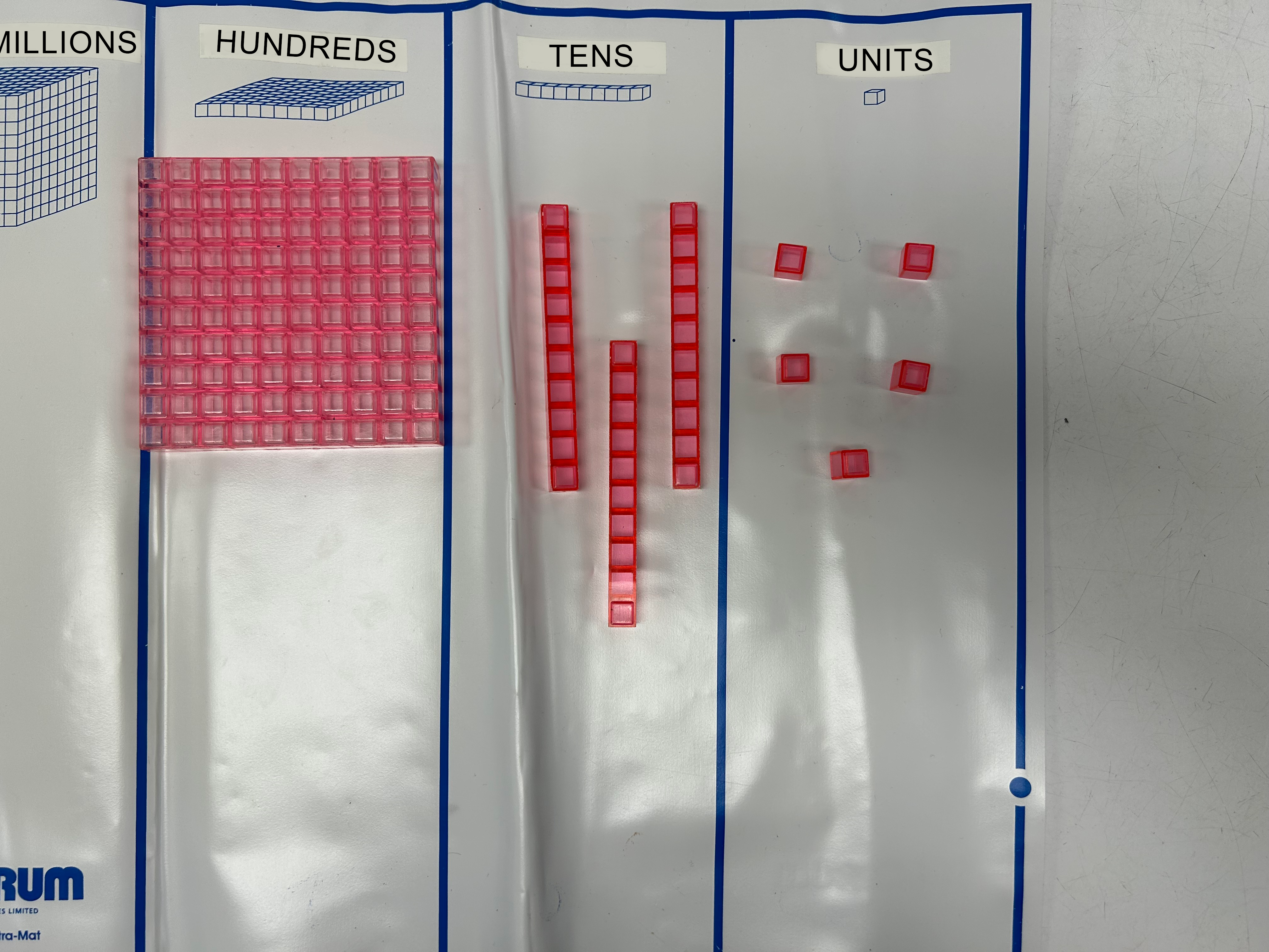The danger is that students may use the material mechanically without making a connection to the underlying mathematical concepts. For this reason, it is essential to ensure that there is real learning about and not just blind use of the model. It is easy for students, for example, to fill in the blanks in the sentence below by looking at the place value mat.