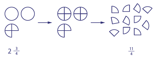 If you have 2 pies, you can cut the 2 pies into fourths, making 8 fourths. Adding the other 3 fourths gives a total of 11 fourths, or \(\frac{11}{4}\).
