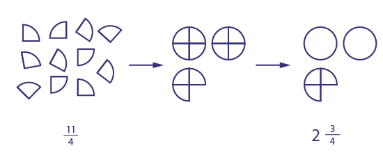 Learning about fractions usually begins with proper fractions, which are fractions less than 1. In Grade 2 , students encounter fractions that represent quantities greater than 1 (for example, counting pieces of pie cut into fourths, there are 11 fourths left). Such situations lead students to mixed numbers (for example, 2 and 3 one fourths).