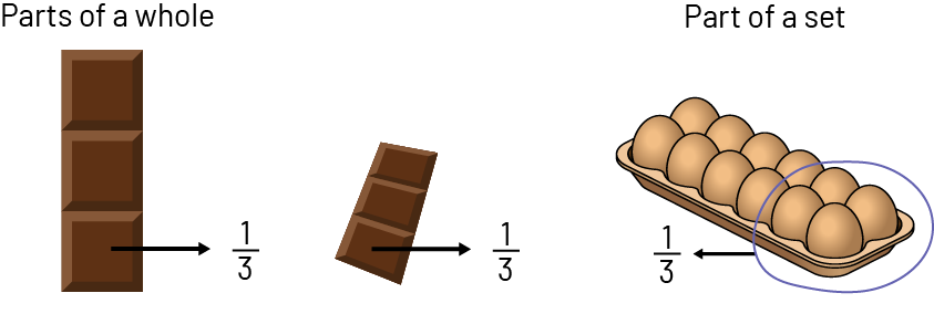 Understanding the representation of quantities by fractions deepens the concept of quantity. It is important to understand that fractions (for example, one-half, one-third, one-fourth) represent different quantities depending on whether they refer to a part of a whole (a length, an area, or a solid) or to a part of a set. For example, one third of a chocolate bar (part of a whole) represents a quantity of chocolate based on the size of the original bar. However, one third of a dozen eggs (part of a set) represents four eggs.