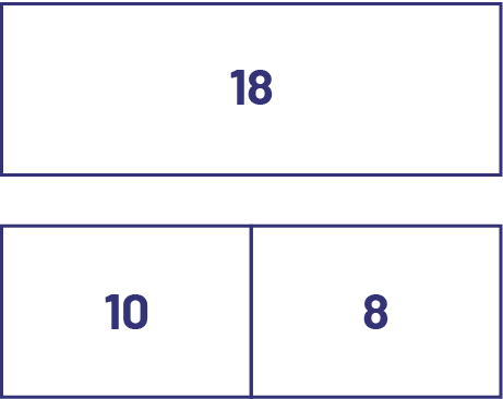 This way of representing the relationship between a number and its parts allows us to see that subtraction is the inverse operation of addition. Thus, since 10 + 8 = 18 and 8 + 10 = 18, then 18 - 10 = 8 and 18 - 8 = 10. In addition, students can understand why addition is commutative (\(10 + 8 = 8 + 10)\) and subtraction is not (\(18 - 10 ≠ 10 - 8\)). Students who have developed good number sense and are able to decompose and combine numbers can use their knowledge to more effectively solve equations such as \(10 + \mathord{?} = 18\) by understanding that we are looking for the difference between 10 and 18.