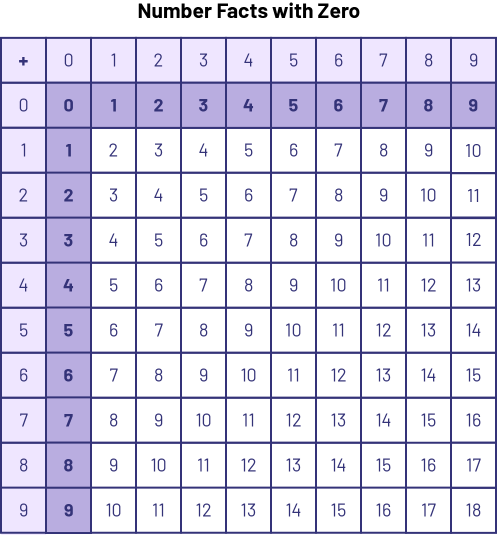 For these basic addition and subtraction facts, zero is one of the terms. Students often generalize that the answer to addition is necessarily larger and the answer to subtraction is necessarily smaller. Understanding of the concept of zero neutrality in addition and subtraction can be reinforced with games involving flash cards and numbered cubes.
