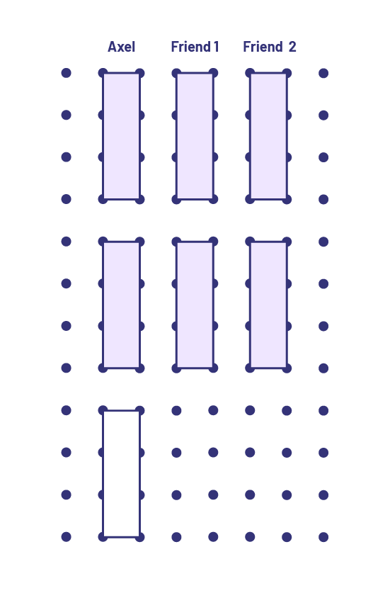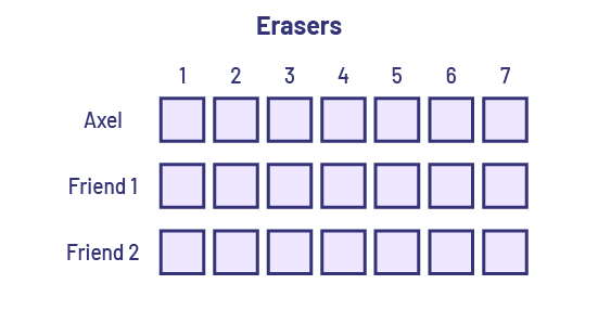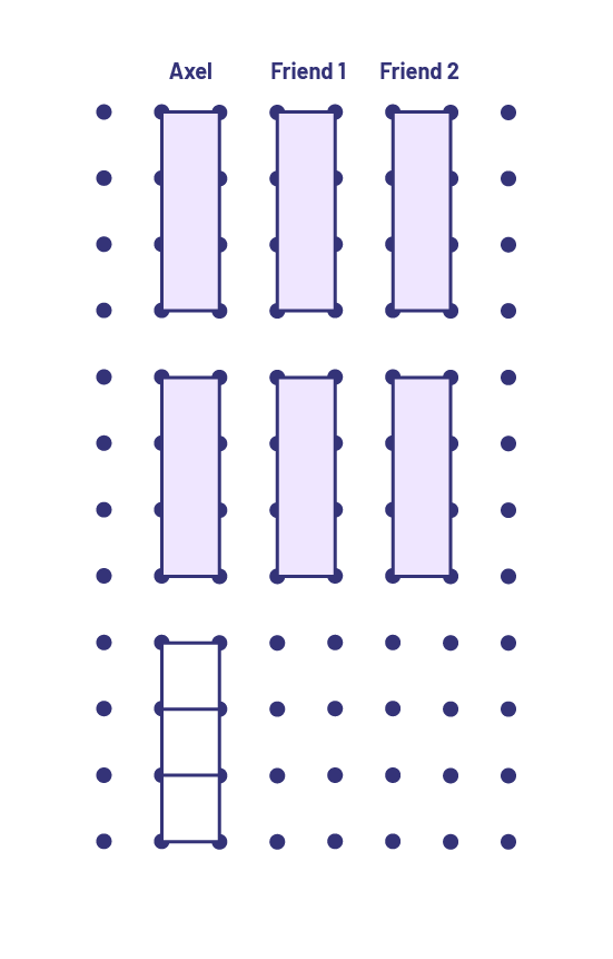 Axel wants to share the remaining gum in his pack equally with two of his friends. He has 7 pieces of gum to share. In order for each person to receive the same amount, how could he share the pieces of gum?