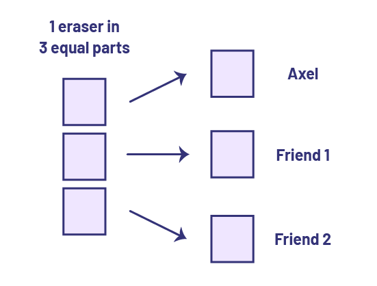 A student might decide to cut the 7 each of the pieces of gum into 3 equal parts, since tthere are 3 children. They then distribute the parts (1 one third) to each student.
