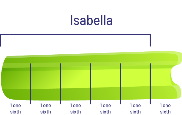 Isabella prepares 6 bowls of salad for herself and her 5 guests. She has only 5 pieces of celery left. How can she divide the 5 pieces of celery equally among the 6 bowls?