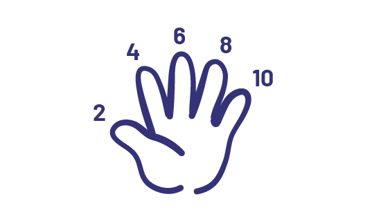 I have 5 fingers to represent the 5 teddy bears. I will count each finger in skips of 2.