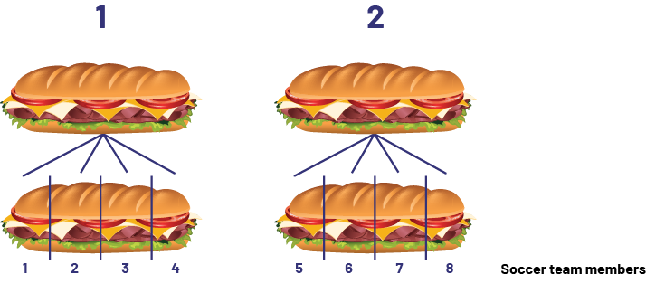 I know that \(\frac{1}{4} + \frac{1}{4} + \frac{1}{4} + \frac{1}{4} = 1 \). So one submarine sandwich feeds 4 people. There are 8 team members, so we need another submarine sandwich.