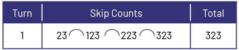 • A member of Team A rolls a die. The number rolled is the number of times the team can count when it is their turn to play. The team also decides, after each roll of the die, whether to count by 1s or in intervals of 10 or 100. For example, if the team's starting number is 23 and it has rolled 3, the team will count three times from 23 depending on the interval it has chosen: by 1s (24, 25, 26), by 10s (33, 43, 53) or by 100s (123, 223, 323).