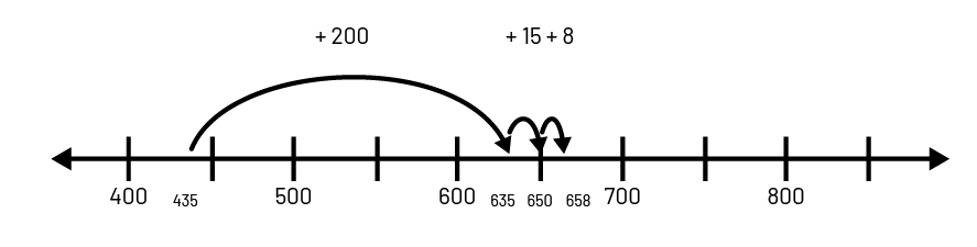 Addition of large numbers can be represented on a number line. For example, students could perform \(435 + 223\) by decomposing \(223 \ (200 + 15 + 8)\) and representing the operation as follows: