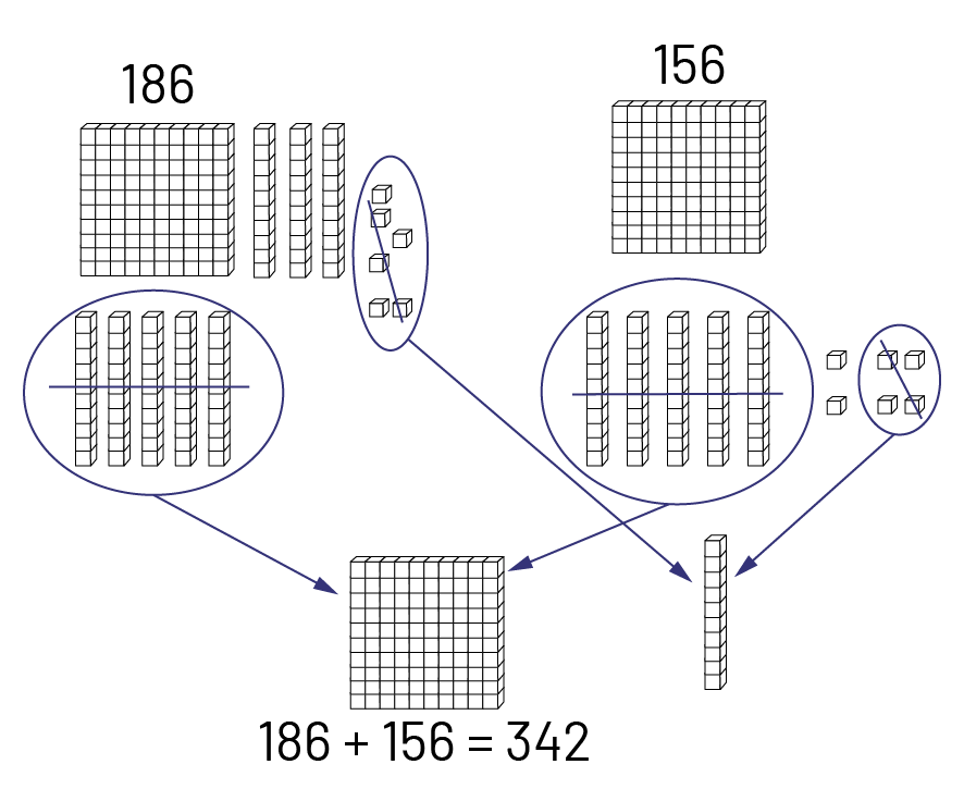 The same numeric expression (\(186 + 156\)) can be represented using drawings. In this way, students demonstrate a certain level of abstraction since a drawing is used to represent 100, 10 or 1.