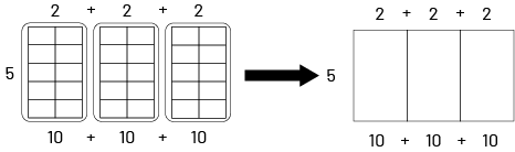 Finally, this same multiplication can also be represented using an array. For example, \(5 \times 6 \) is represented by a rectangle with 5 rows of 6 small squares. The student could use the distributive property by decomposing the 6 into \(2 + 2 + 2 \), so \((5 \times 2) + (5 \times 2) + (5 \times 2) \)