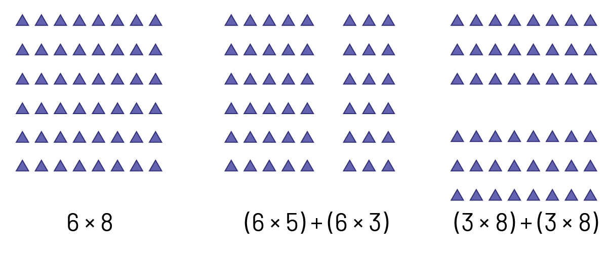 The following example illustrates how the distributive property can be used to calculate \(6 \times 8 \). In one case, we decompose the factor 8 to obtain \(5 + 3 \). We then have \(6 \times (5 + 3) = (6 \times 5) + (6 \times 3) \). In the other case, we decompose the factor 6 to obtain \(3 + 3 \). We then have \((3 + 3) \times 8 = (3 \times 8) + (3 \times 8) \).