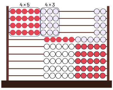 I am going to do the multiplication \(4 \times 8 \) with the Rekenrek, because I will have the same result as \(8 \times 4 \). So I will place 8 beads to the left of the Rekenrek on the first 4 rows. I see that there are 4 rods of 5 red beads and 4 rods of 3 white beads. I can calculate these two multiplications more easily now, since 4 groups of 5 beads is \(4 \times 5 = 20 \), and 4 groups of 3 beads is \(4 \times 3 = 12 \).