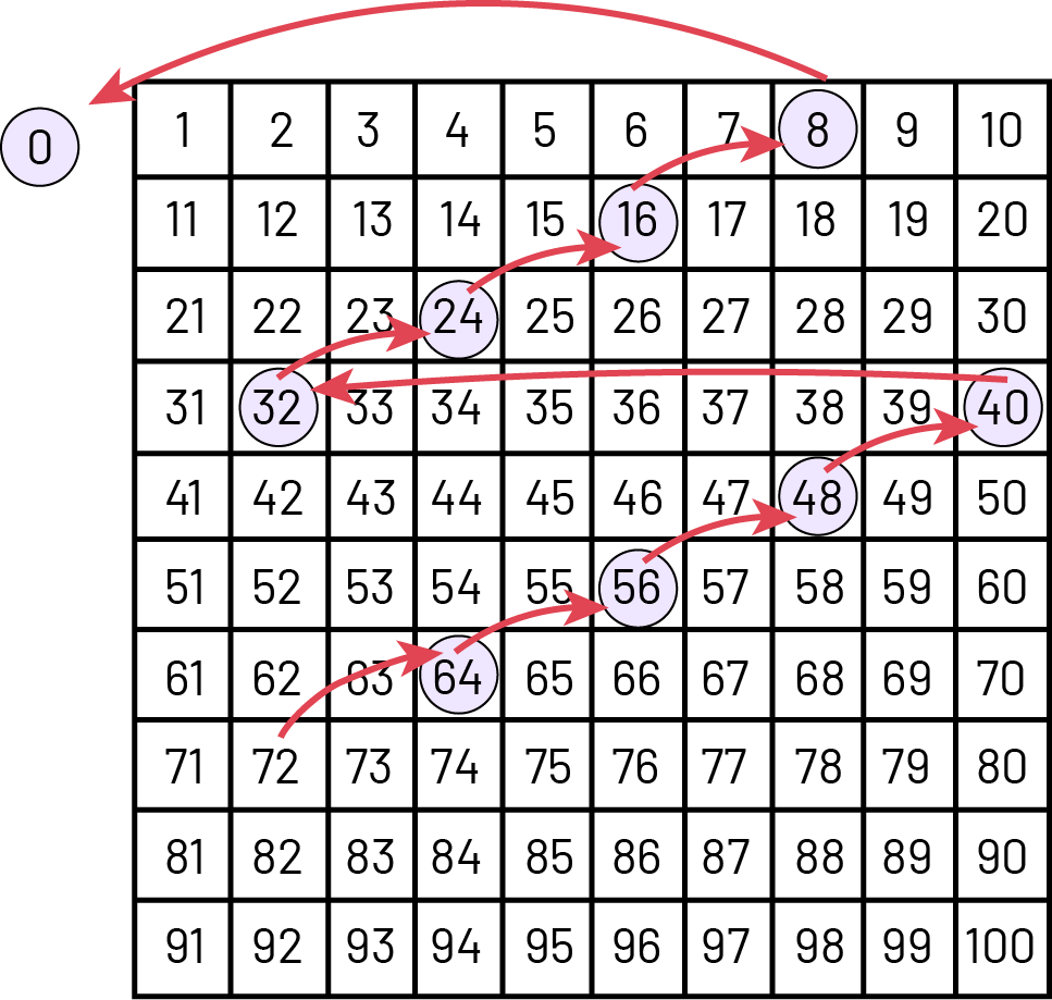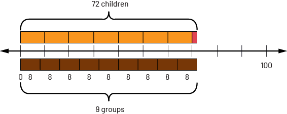 I know that there are a total of 72 children and that the groups are made up of 8 children. I will perform repeated subtractions by representing my groups in a hundreds chart, by putting a circle whenever I make a group of 8.